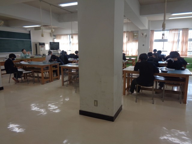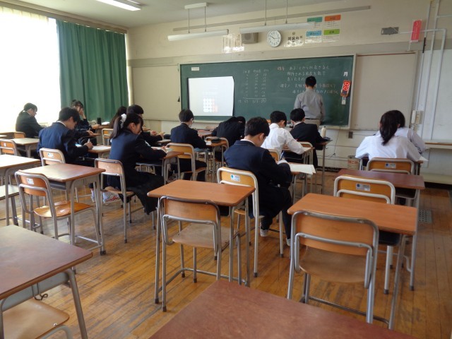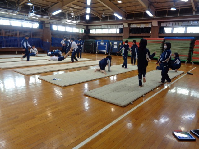 2校時の1年生の授業は、起こりやすさの表し方(数学・写真付き)、国語、オセアニアの自然と歴史(社会)です。2年生は音楽、マット運動(保健体育・写真付き)、家庭科(写真付き)です。3年生は学級活動です。