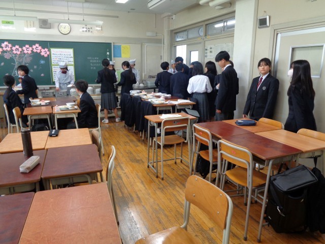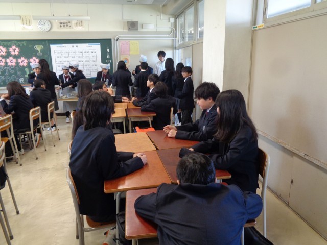 1年生にとって、中学校初の給食です。給食当番の生徒たちがおぼんの上に食器をのせていきます。おいしく食べられましたか?