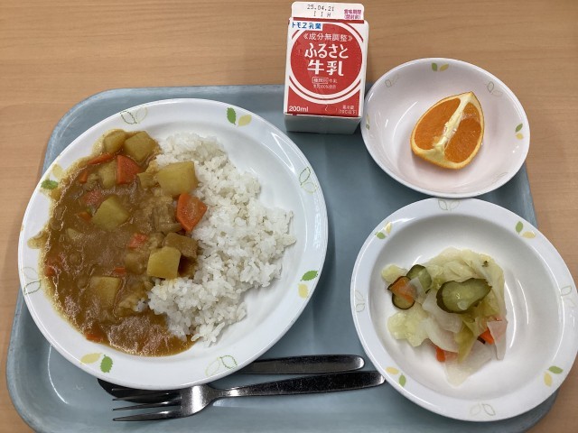 今日の献立は、カレーライス、野菜の甘酢和え、清見オレンジ、牛乳です。