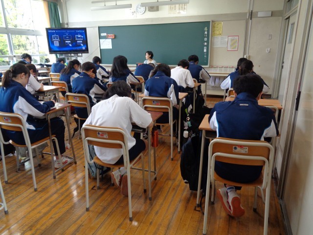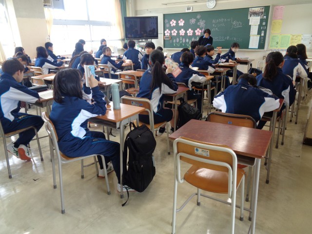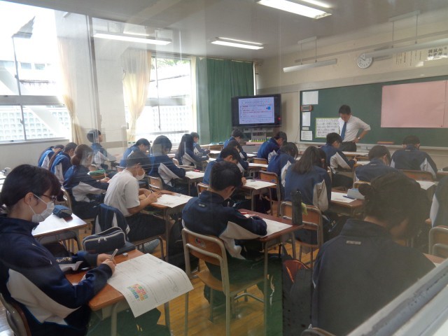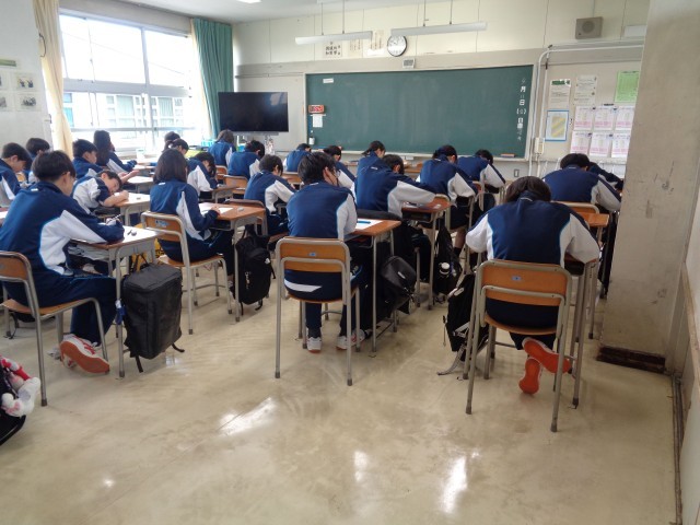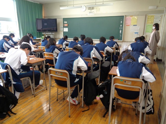 2校時の1年生は身体計測が終わったところです(写真付き)。2年生は数学のテストをしています(写真付き)。3年生は地球規模の諸問題について考えています(写真付き)。