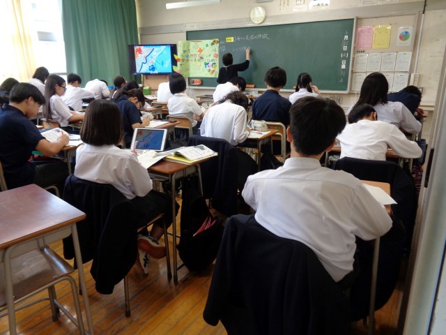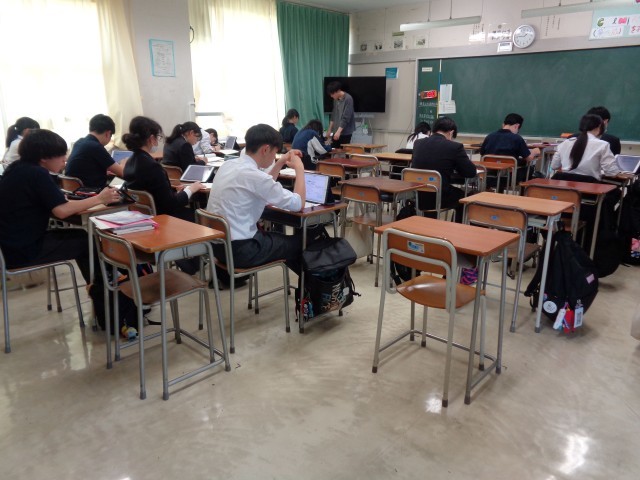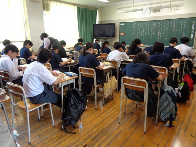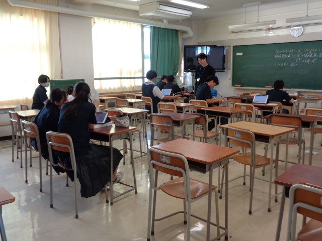5校時の1年生の授業は英語(写真付き)、食事の役割(家庭科)です。2年生は、人物同士を比べて登場人物の人間関係をとらえよう(国語・写真付き)、短距離走(保健体育・写真付き)、酸化銅を加熱したときの変化(理科)です。3年生は、日露戦争の背景・過程・影響を理解しよう(社会)、3つの気団の特徴(理科・写真付き)、数学(写真付き)です。