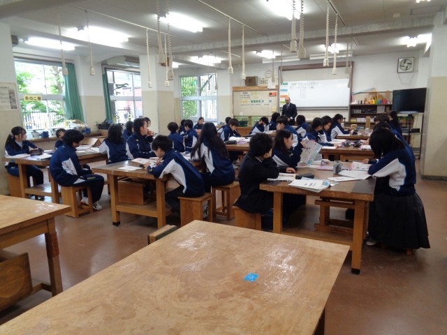 1校時の1年生の授業は、国の面積と人口について理解する(社会)、作品を読む・語句の学習(「はじまりの風」・国語・写真付き)、木材の性質を理解する(技術・写真付き)です。2年生は、単項式の乗法・除法(数学・写真付き)、短距離走(保健体育・写真付き)です。3年生は美術(写真付き)、語句に着目しながら本文を読み、設定と構成、大まかな内容をとらえよう(「握手」・国語・写真付き)、四季の天気についてまとめよう(理科・写真付き)です。