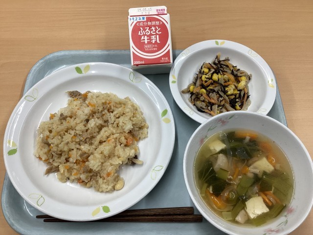 今日の献立は、中華五目おこわ、ごぼう入りサラダ、すまし汁、牛乳です。