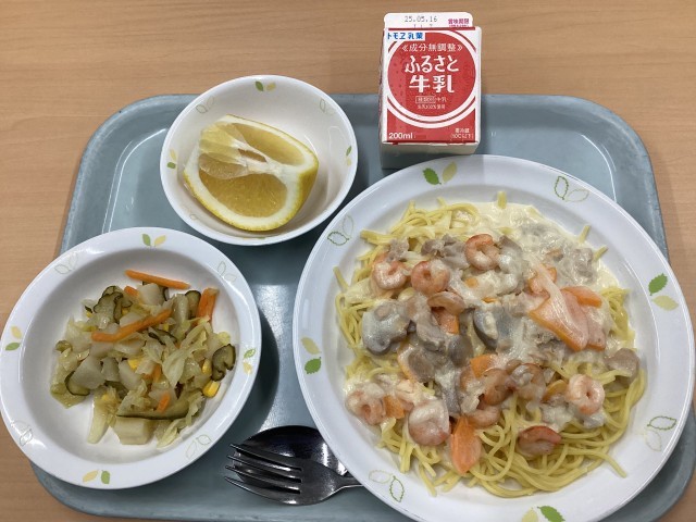 今日の献立は、スパゲッティクリームソース、ポテト入りフレンチサラダ、河内晩柑、牛乳です。