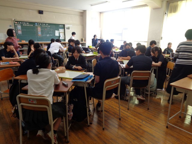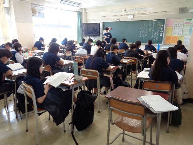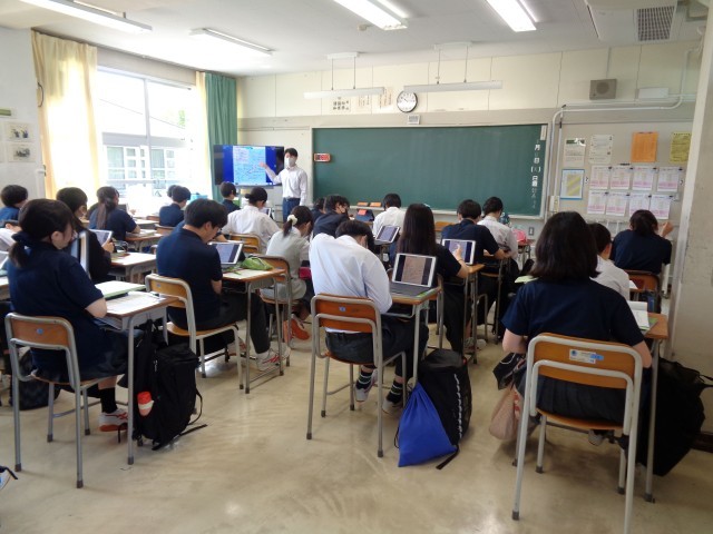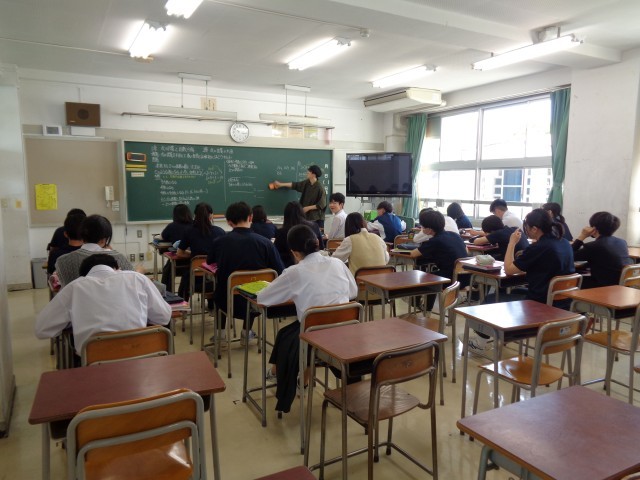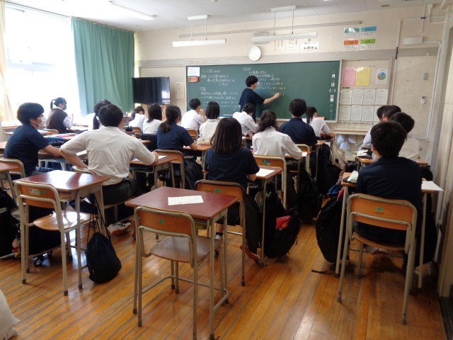 2校時の1年生の授業は、バトンパスの練習(保健体育・写真付き)、マツの花のつくりと種子(理科)、段落の役割について考えよう(ダイコンは大きな根?・国語・写真付き)です。2年生は英語(写真付き)、発電のしくみ(社会・写真付き)です。3年生は、式の計算を利用して数の性質を証明するにはどうするか(数学・写真付き)、長距離走(保健体育)です。