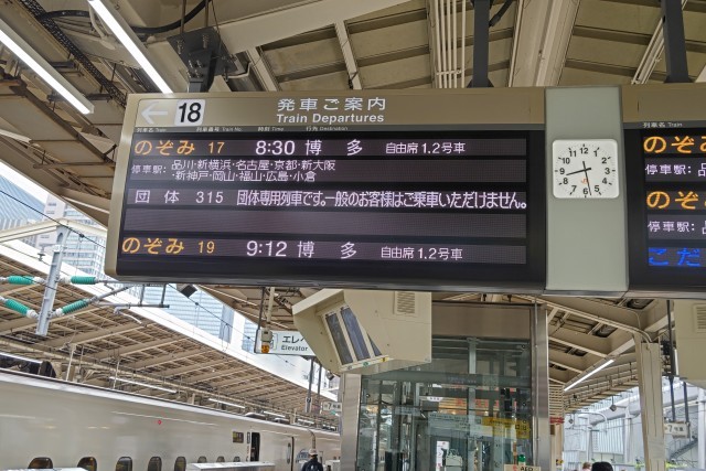 新幹線18番ホームに来ました。表示板には「団体専用列車」とあり、時刻の表示はありません。