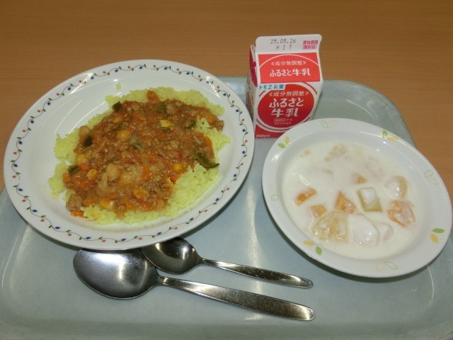 今日の献立は、ひよこ豆のカレー、フルーツのヨーグルトがけと、牛乳です。