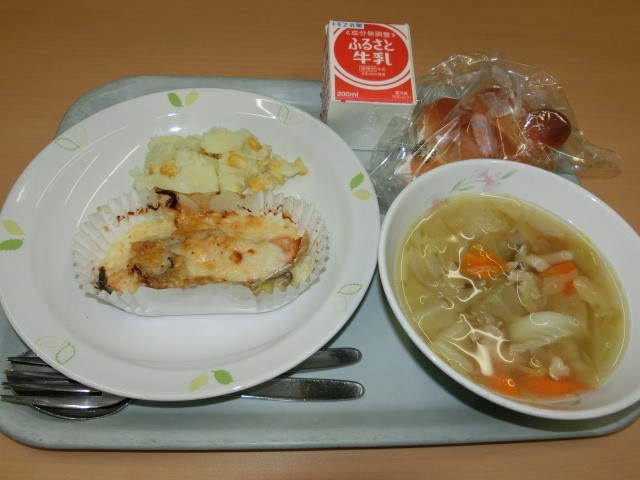今日の献立は、ミルクパン、鮭のマヨネーズ焼き、コーンポテト、ベーコンと野菜のスープと、牛乳です。