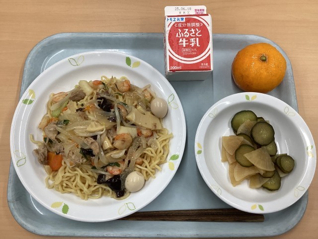 今日の献立は、五目あんかけ焼きそば、きゅうりと大根のピリ辛和え、冷凍みかん、牛乳です。