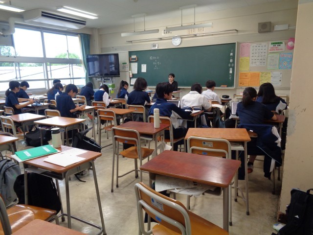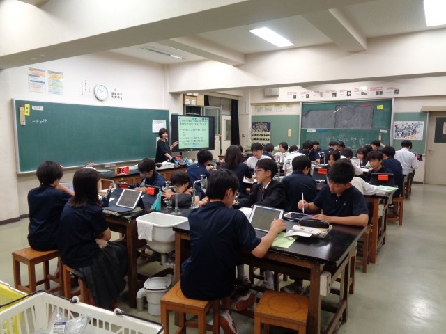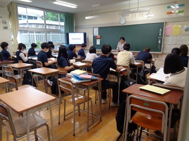 5校時の1年生の授業は体力測定、話の構成を工夫しよう(国語)、数学(写真付き)です。2年生は理科、美術、どうやって風力・風向を測定するか(理科)です。3年生は英語(写真付き)、無線機能を使った通信(技術)です。