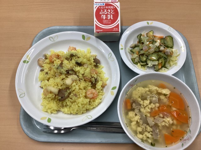 今日の献立は、シーフードピラフ、イタリアンスープ、チーズサラダ、牛乳です。