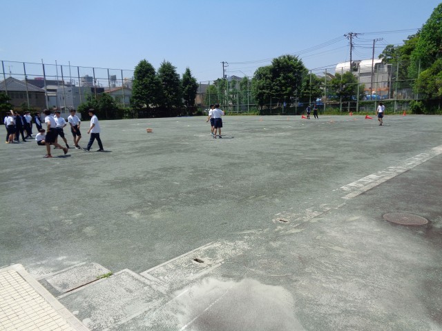 2校時の1年生の授業は、シャトルラン(保健体育)、理科(写真付き)、知的財産権の保護と利用(技術)です。2年生は英語、自立語(国語)です。3年生は数学、ハンドボール投げ(保健体育・写真付き)です。
