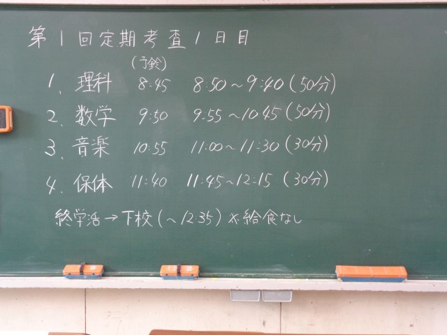 今日は定期考査初日です。科目は理科、数学、音楽(30分)、保健体育(30分)です。下校は12時35分の予定です。給食の提供はありません。暑い中ですが頑張りましょう。