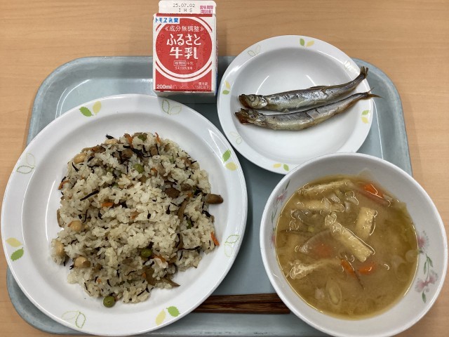 今日の献立は、大豆入りひじきごはん、焼きししゃも、さつま汁、牛乳です。