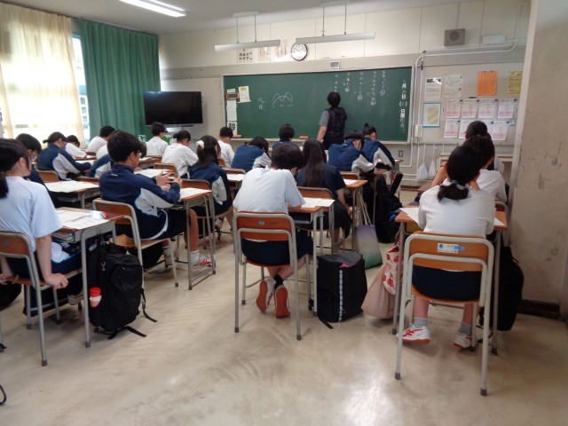 2校時の1年生の授業は、プール(写真付き)、理科、情報について(技術)です。2年生は定期考査解説(英語)、国語(写真付き)です。3年生は、平方根の利用(数学)、体力測定(保健体育)です。