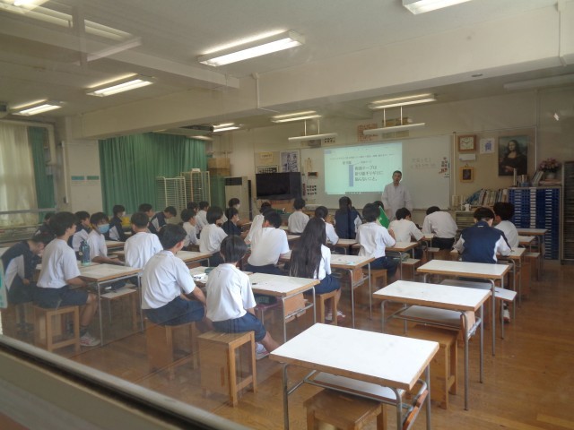 5校時の1年生の授業は社会、詩を音読して感じたことを交流しよう(国語)、水泳(写真付き)です。2年生は代金に関する問題を連立方程式を用いて解こう(数学)、レタリング(美術・写真付き)です。3年生は、戦争の終結(社会)、理科、英語です。
