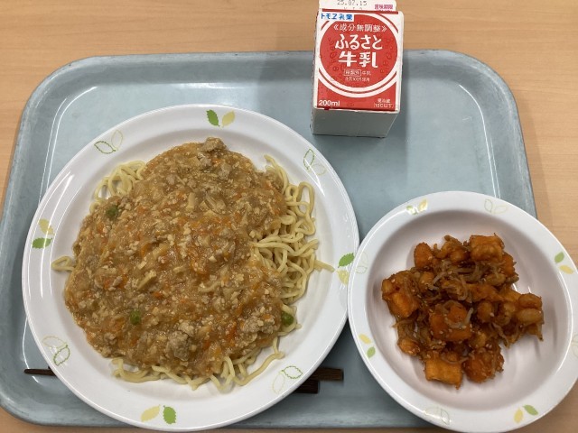 今日の献立は、肉みそめん、カルシウムビーンズ、牛乳です。