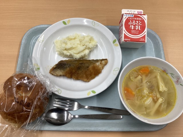 今日の献立は、パインパン、魚のバーベキューソース、マッシュポテト、マカロニスープ、牛乳です。