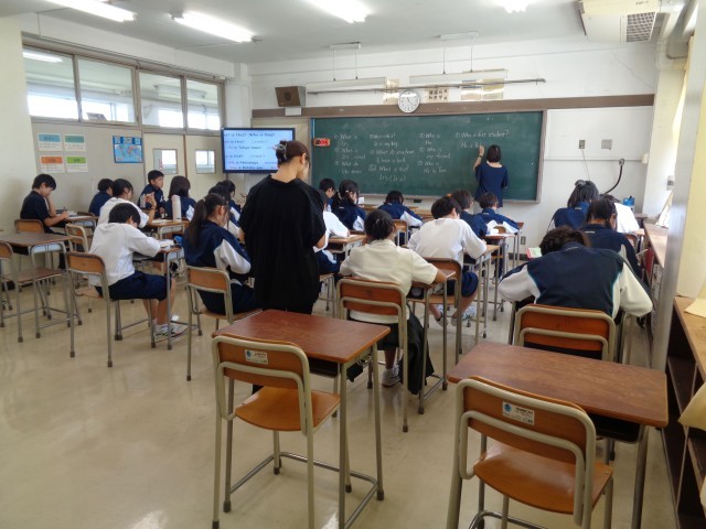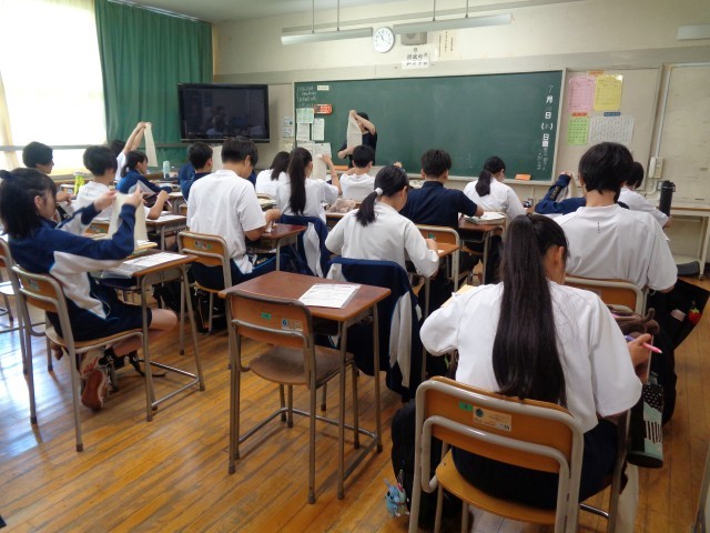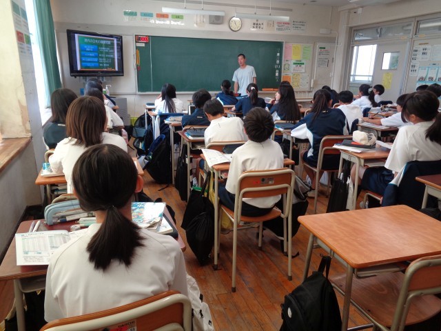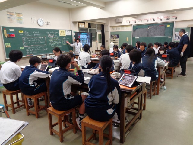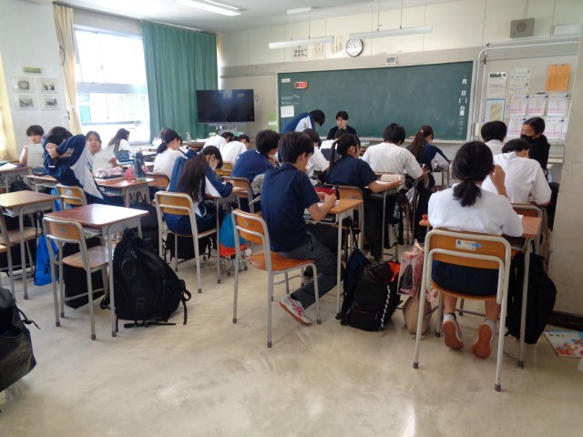 3校時の1年生の授業は、現代の日本の健康問題(保健・写真付き)、英語(写真付き)です。2年生は数学(写真付き)、基礎縫い(家庭科・写真付き)です。3年生は水泳(写真付き)、電池の+-は何によって決まるのか(理科・写真付き)、美術です。
