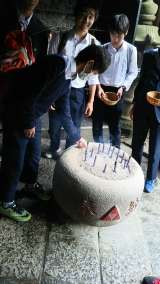 銭洗弁財天に最初の班が到着しました。お金をいっぱい洗うと意気込んでいます。(曽根...
