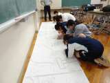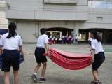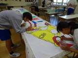 美術部が運動会の横断幕を作成してます。考えたデザインを布に写して文字のバランスを...