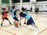 体育館で女子バスケットボール部が活動しています。ボール運びの練習をしています。1...