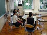 吹奏楽部が第2音楽室で活動しています。パートごとに分かれての練習です。模範演奏を...