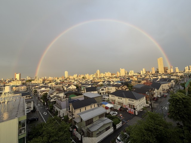 放課後の空には驚くほど綺麗な虹の架け橋が。見惚れてしまうほど、心洗われる、つかの...