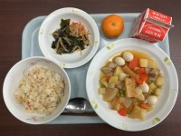 きのこごはん 豚肉と大根のうま煮 もやしとわかめのごま和え くだもの 牛乳