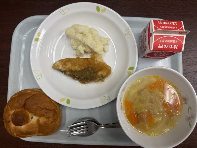 パインパン 魚のバーベキューソース マッシュポテト マカロニスープ 牛乳