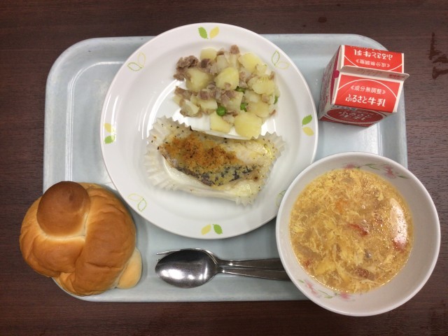 ミルクパン 魚のチーズハーブパン粉焼き ジャーマンポテト 卵とトマトのスープ 牛乳