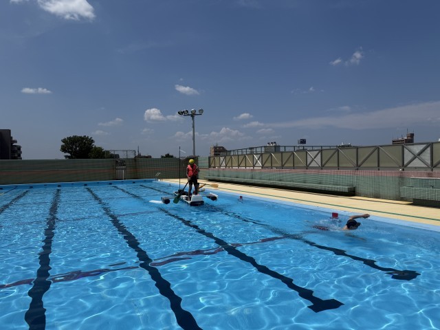 本日は学校のプールで事前リハーサルを行いました。手作りのいかだに乗り、皆で声を合わせて協力して、少しずつ前に漕ぎ進めることができました。