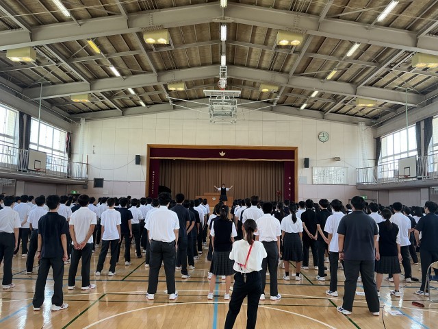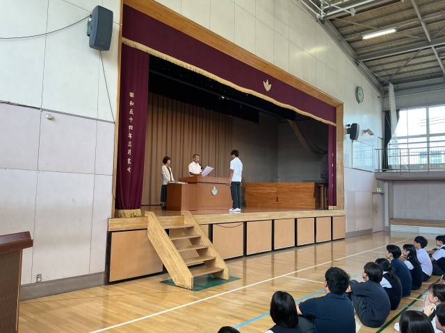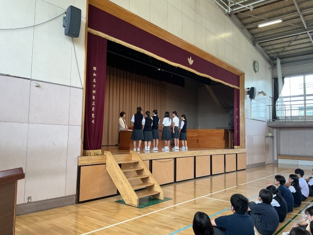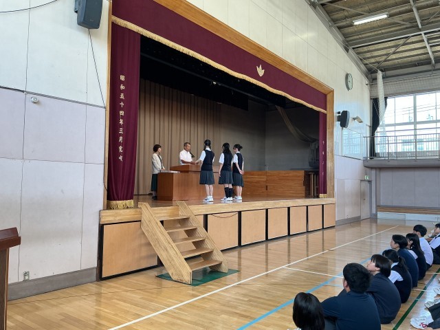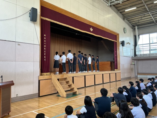 全員で校歌を練習した後、表彰を行い、吹奏楽部、水泳、バドミントン部、陸上部の生徒の優秀な成績が紹介され、表彰されました。
