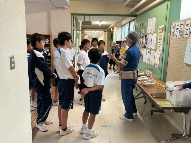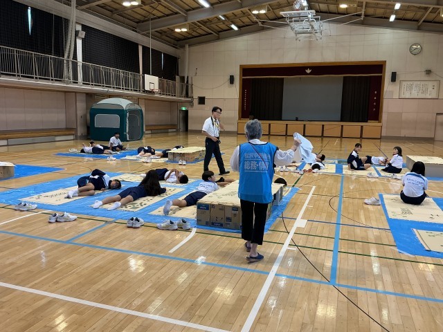 マンホールトイレ体験、ダンボールベット等を用いた避難所生活体験、防災倉庫見学、災害時用公衆電話体験、避難所体験動画視聴、クラス毎にたくさんの体験をさせていただきました。