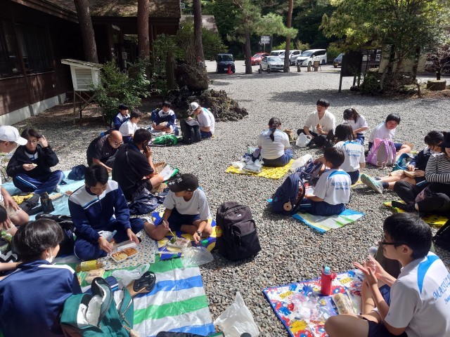 お弁当を仲良く食べ始めました。他の団体がいないということで、外で食べることを許可いただきました。