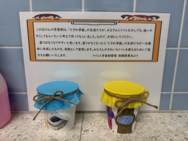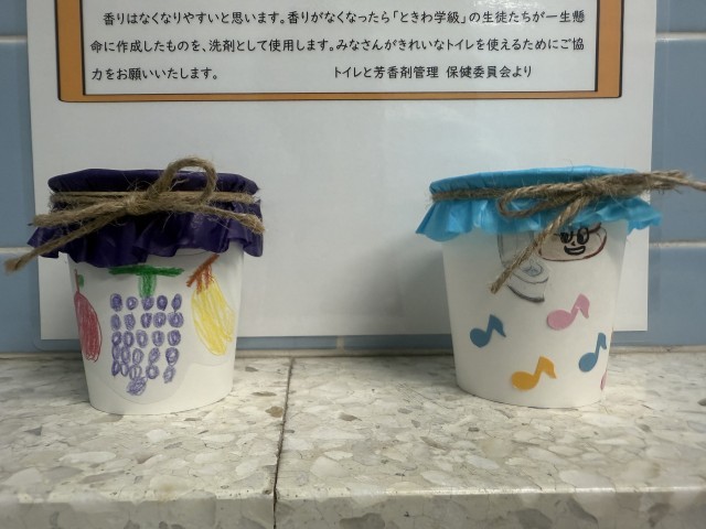 現在、校内のトイレには保険委員会と、ときわ学級の生徒が作成した可愛らしい芳香剤が設置されています。
