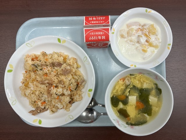 キムチチャーハン 卵とわかめのスープ フルーツのヨーグルトがけ 牛乳