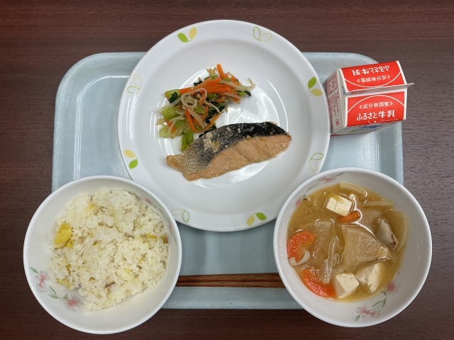 さつま芋ごはん 魚の香味焼き おひたし 豚汁 牛乳