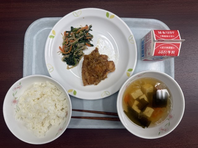 ごはん 鶏肉のねぎソースがけ ほうれん草のごま和え すまし汁 牛乳