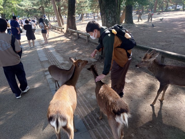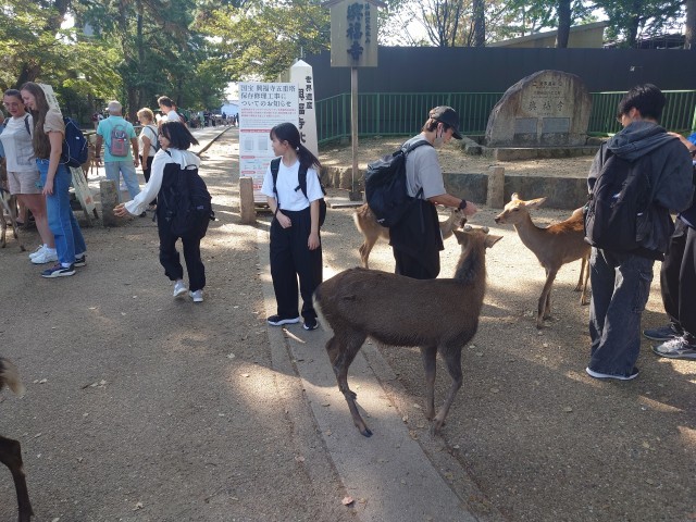 多くの班が来る奈良公園に来ました。鹿と戯れ?ています。