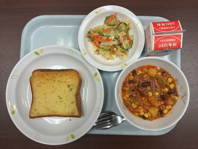 ガーリックトースト チリコンカン チーズサラダ 牛乳
