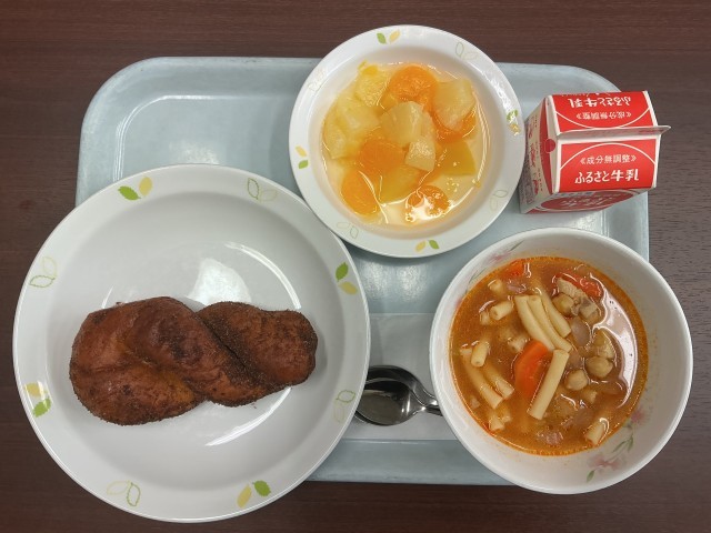 ココア揚げパン ひよこ豆入りミネストローネ フルーツポンチ 牛乳