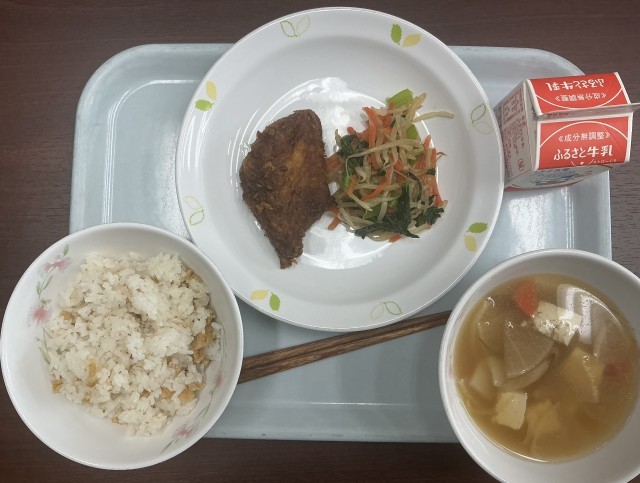 こぎつねごはん さばのカレー揚げ おひたし けんちん汁 牛乳