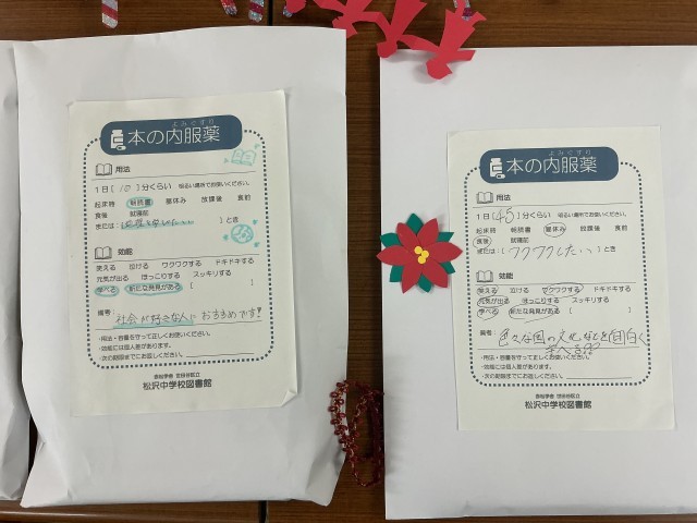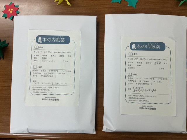 図書委員からの企画として、「本の読み薬」も開催中。内服薬の封筒の中には、図書委員のおすすめ本が封入されています。借りる人は表書きの効能を見て封筒を選び、中身は図書室を出るまでわからないというルールだそうです。