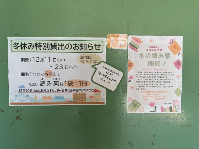 図書室では本日より冬休み特別貸出が始まります。