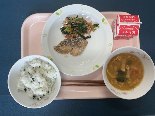 わかめごはん 魚のゆず味噌焼き ごま和え かぼちゃのみそ汁 牛乳