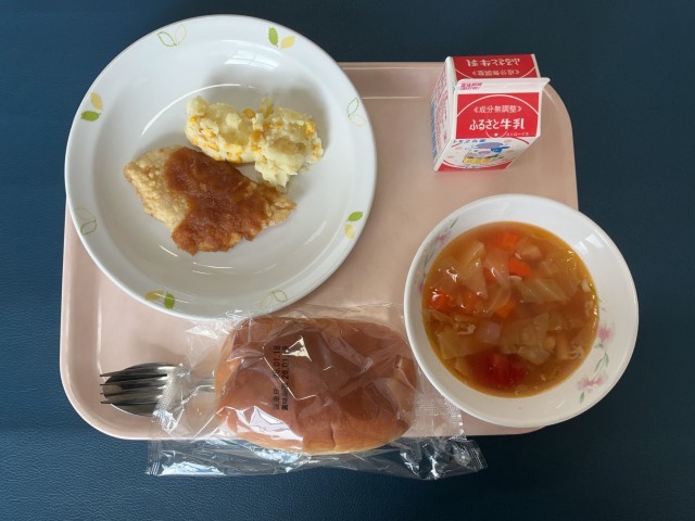 ダイスチーズパン 魚のバーベキューソース コーンポテト ミネストローネ 牛乳