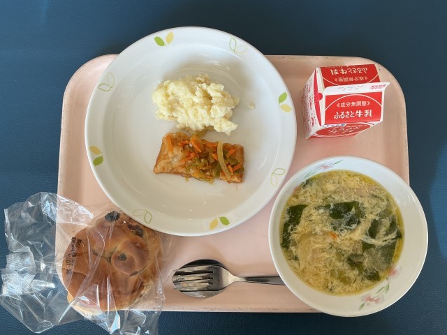 ぶどうパン いかのマリネソースがけ クリームポテト 卵と青菜のスープ 牛乳