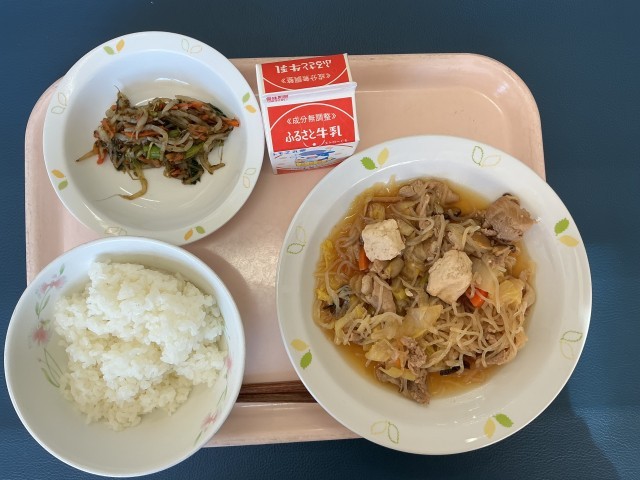 ごはん(有機米) すき焼き煮 野菜ののり和え 牛乳