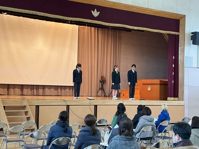 生徒会の役員(2年生が校外学習で不在のため、3年生の前役員の協力のもと)に学校行事、標準服について概要を説明してもらいました。拍手を頂き好評でした。